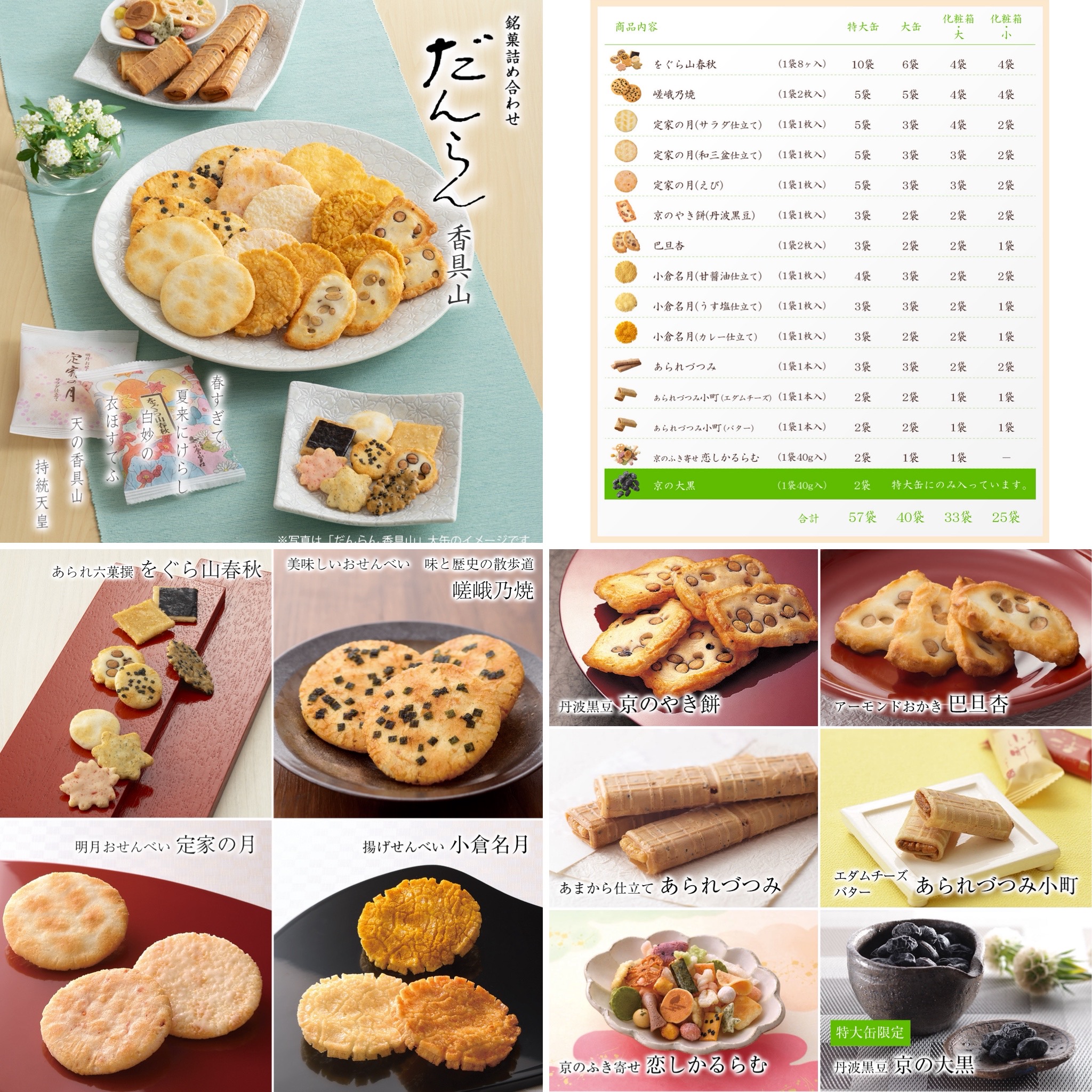 香具山為小倉山莊的產品中,唯一集結小倉山莊招牌商品及口味,包括最受歡迎的產品“山春秋”、“嵯峨乃燒”、"定家之月"、"小倉明月"等,禮盒中袋數從25袋至58袋不等,收禮的人可以享受到小倉山莊多款招牌風味,無論禮盒品牌知名度及品質都是仙貝類的佼佼者,而且禮盒內容的豐富澎湃、體面大方,是過節送禮的最好選擇之一。
