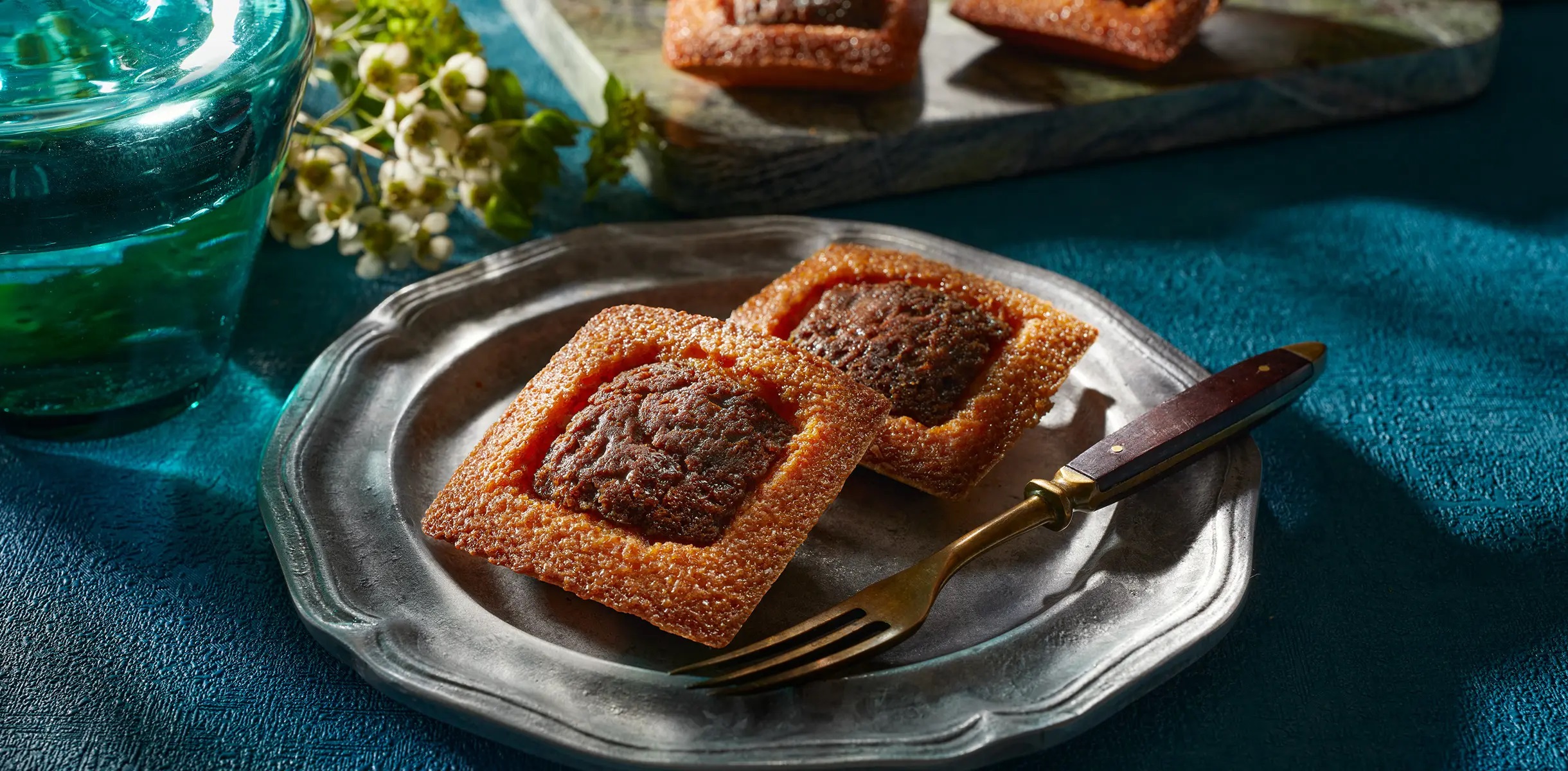 使用北海道發酵奶油和香濃的西班牙杏仁製成的布蕾費南雪,表面沾滿了芳香的布蕾巧克力醬,口感濕潤多汁。