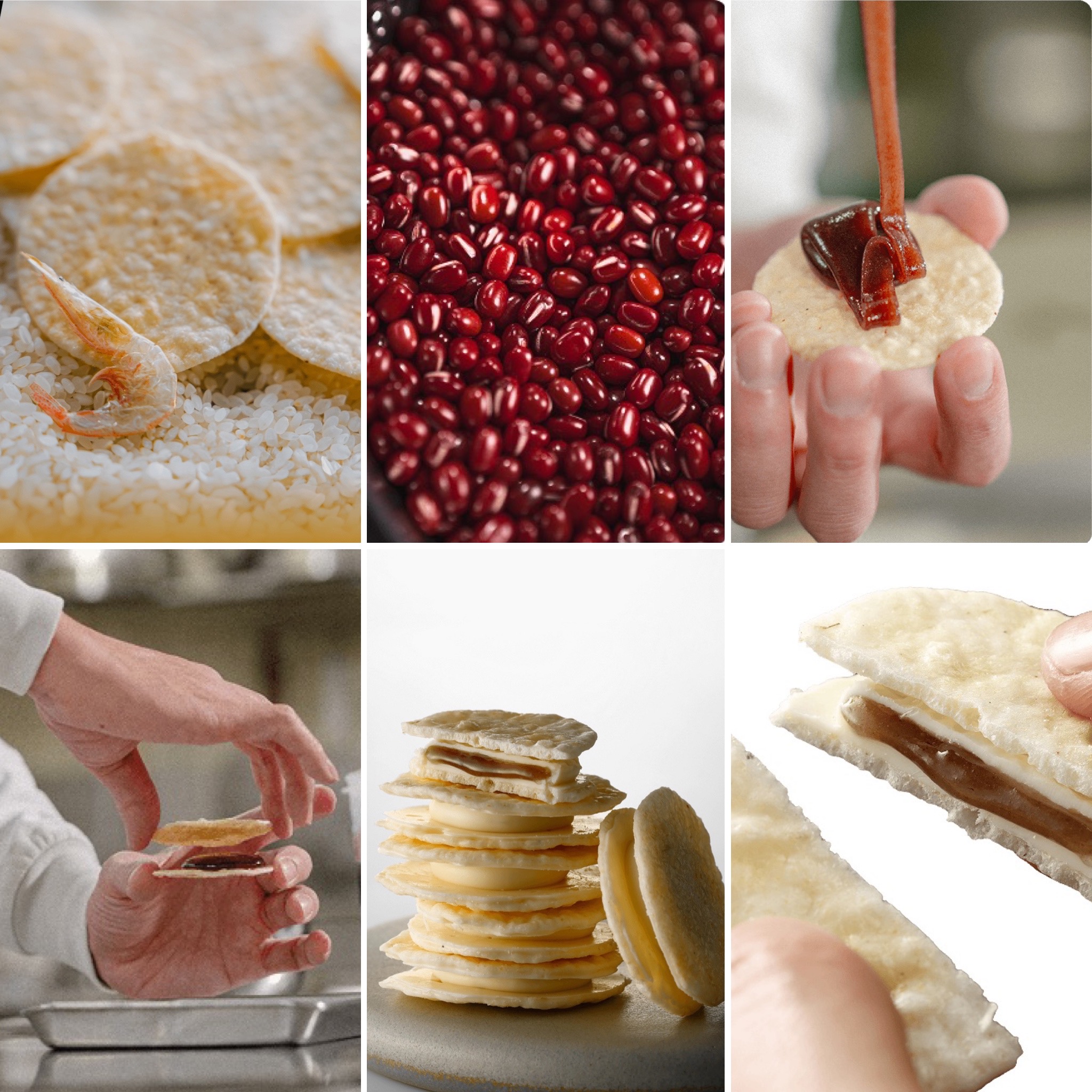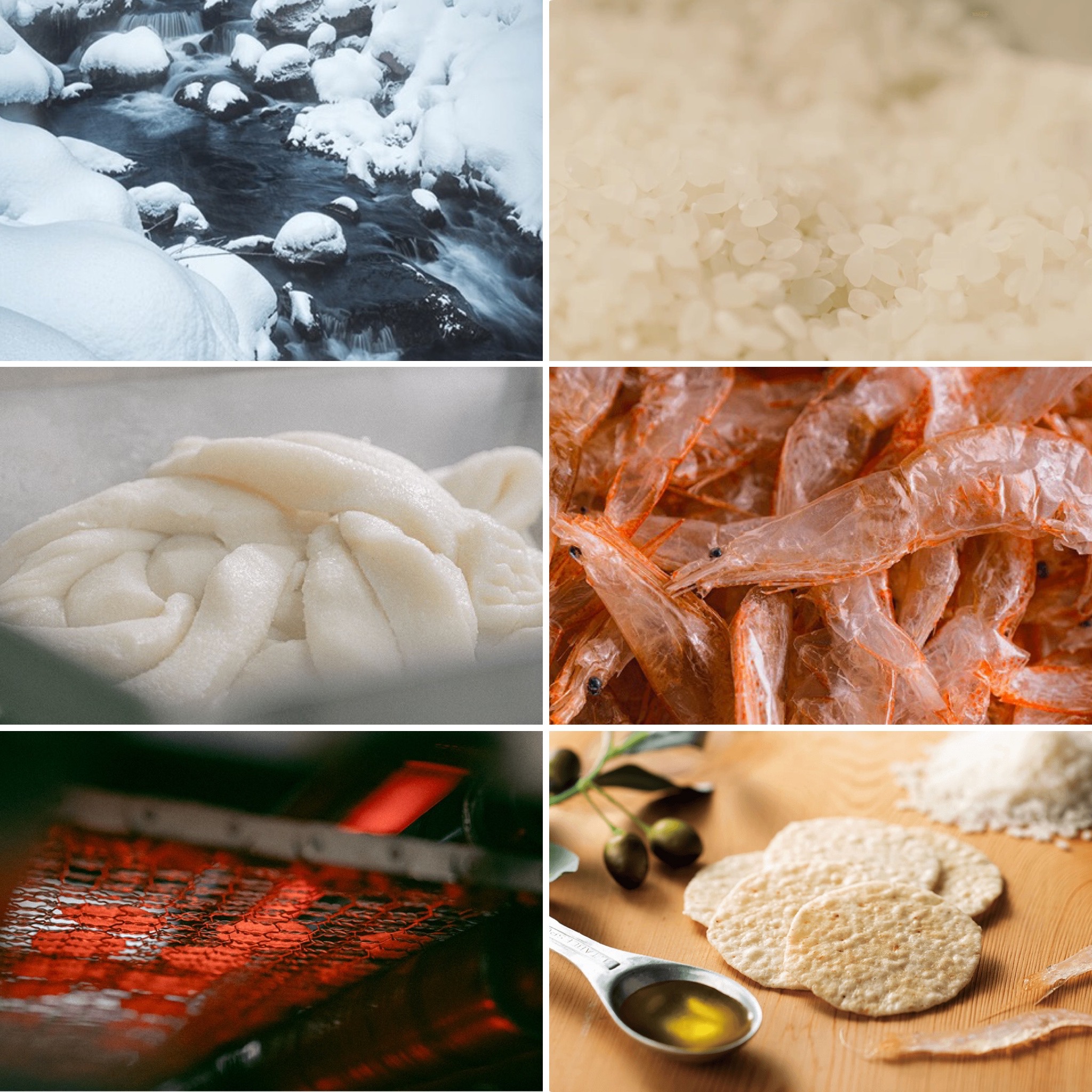 再把把富山灣的寶石「白蝦」揉入麵糰中,緊緊鎖住白蝦的香味和美味在麵糰裡,透過精密的磨切,切成形狀與厚度均勻的米餅麵團,並以均勻的火候燒製,完成口感與色澤完美、口感輕盈的香噴噴仙貝。