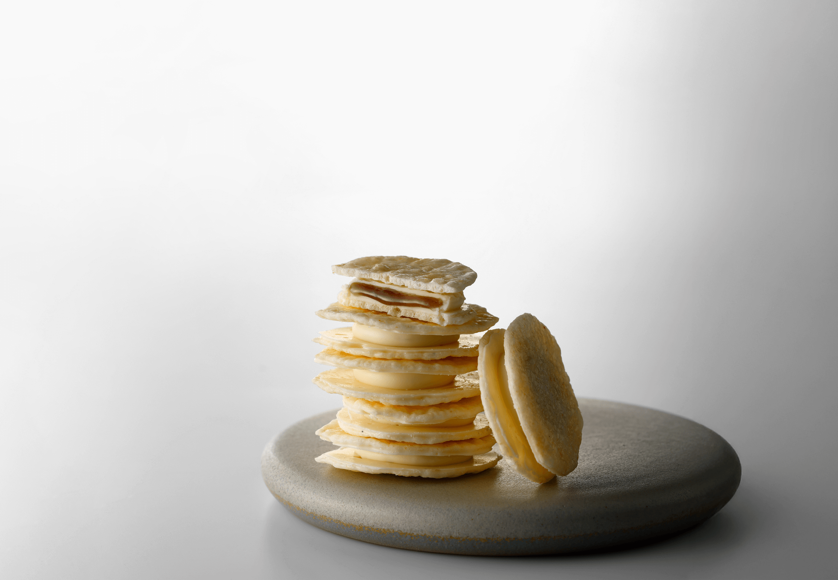 經過二年的研究及不斷試驗,設計出以白巧克力均勻塗在仙貝上做為隔層,完美的避免