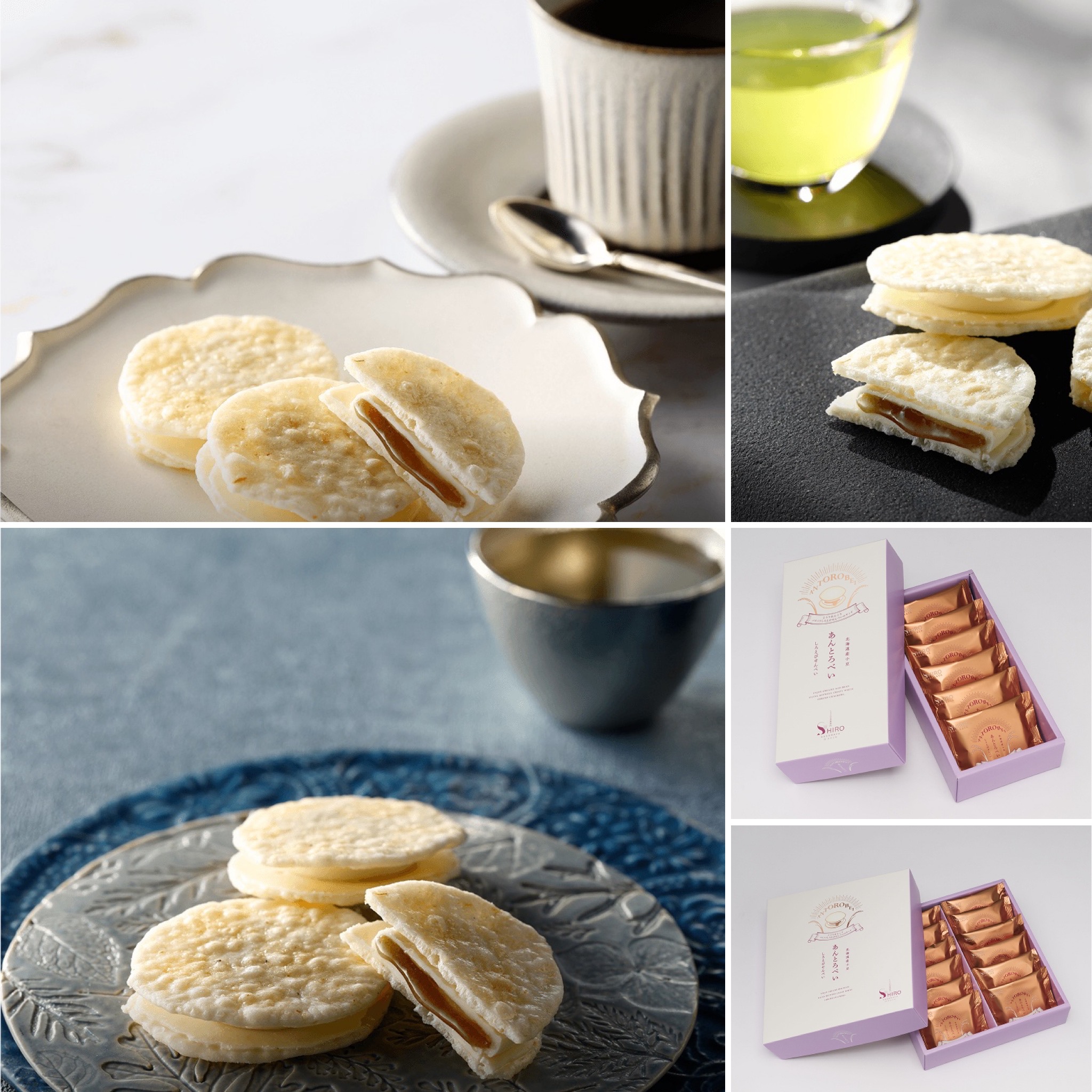 ~玉露綠茶的優雅甜度與焙茶的芬芳,將豆餡的柔和甜味和白蝦仙貝的美味完美地融合在一起。