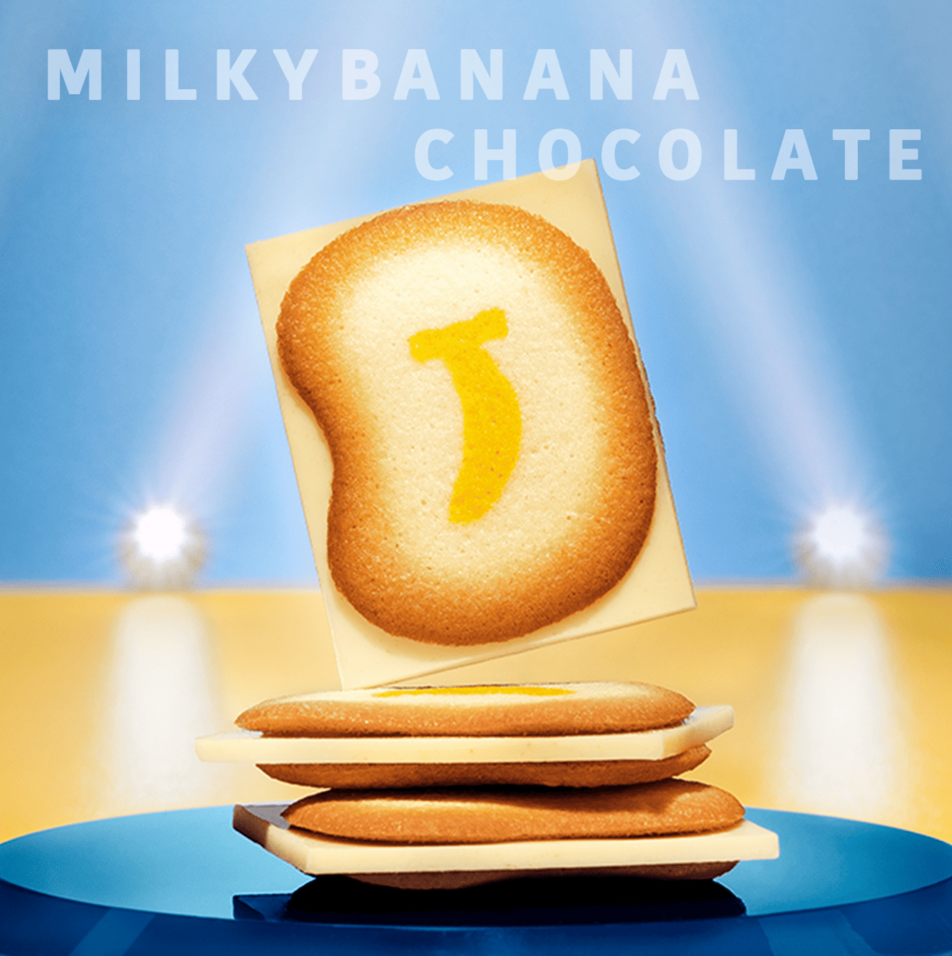 以「奶香味」為特色製作的牛奶香蕉巧克力夾心,夾在以「輕盈」的貓舌頭餅乾(