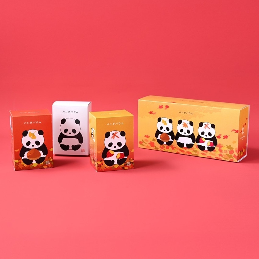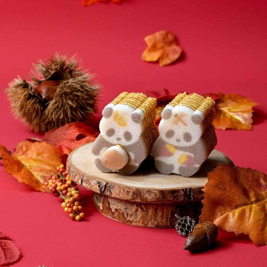 栗子風味柔軟、溼潤、甜美芬芳的日式栗子味的麵糰,精心烤了好幾層的年輪蛋糕,最上層使用食品打印及水刀切割技術,畫了抱著大栗子的貓熊,可一邊慢慢脫模一邊享用。