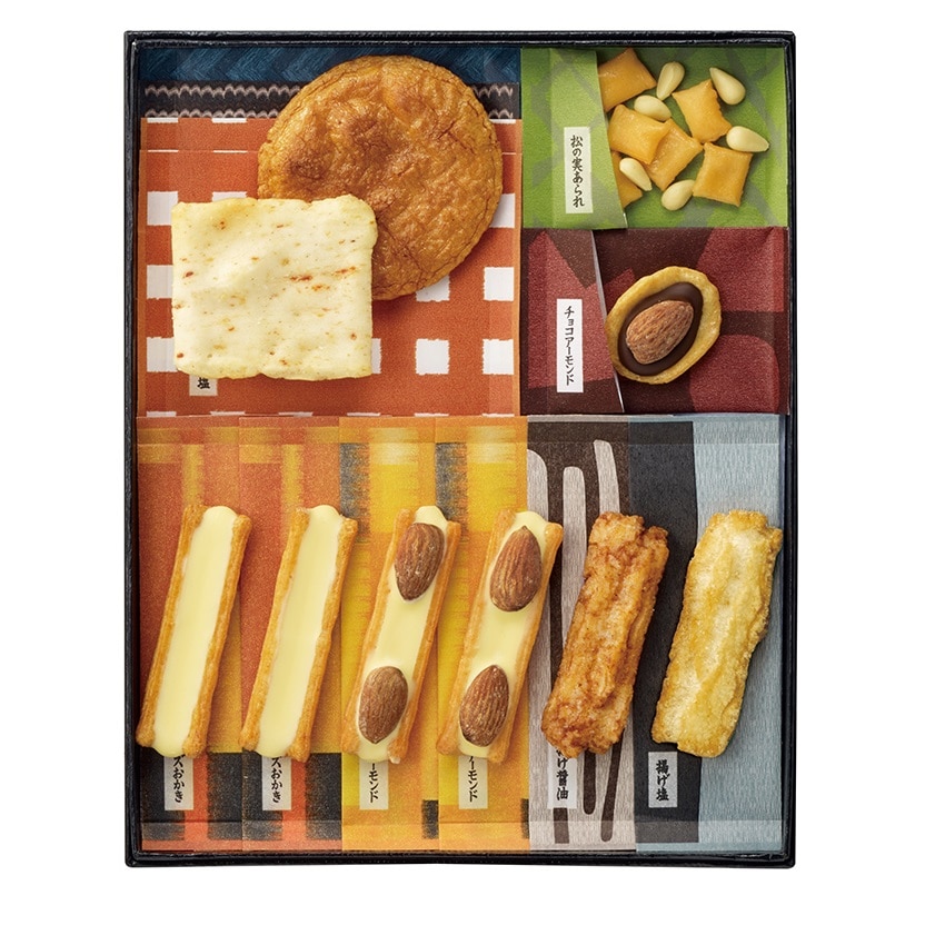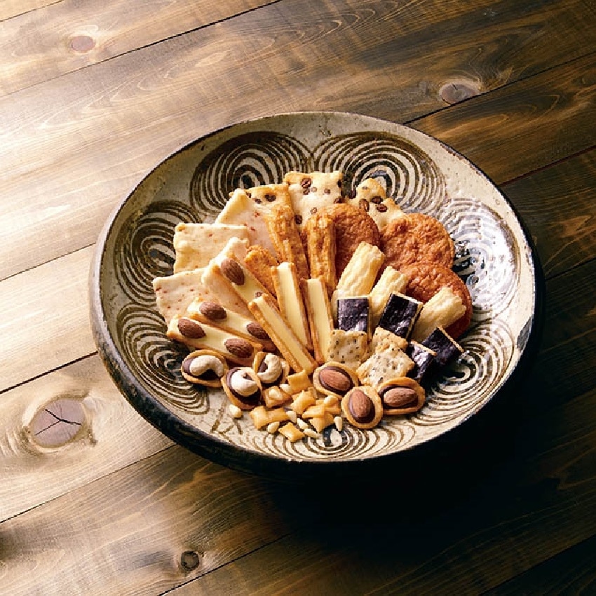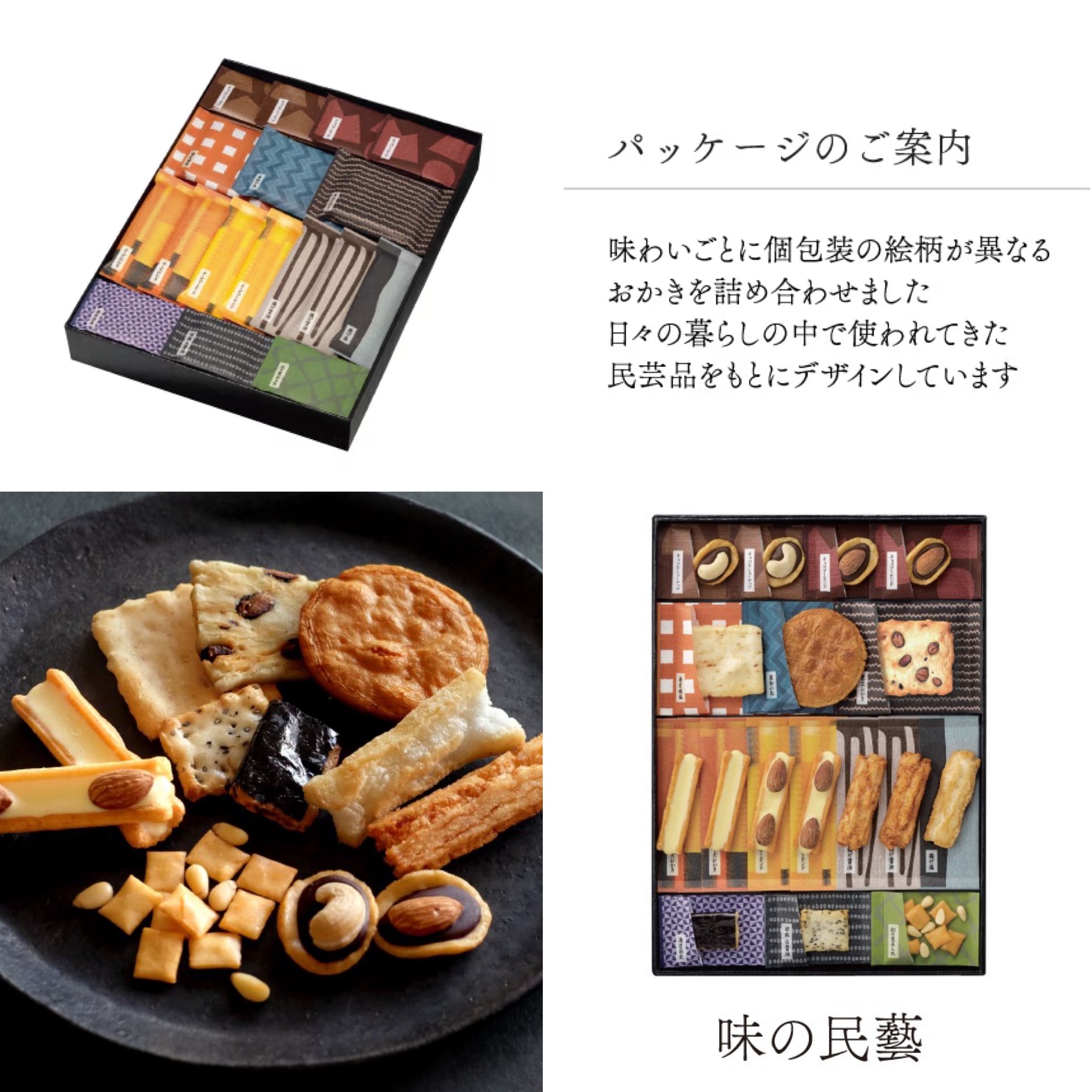 招牌的仙貝商品『民藝之味』,以日本民間藝術美感來設計各式仙貝及包裝,除了保留日本傳統的仙貝工藝與美味元素外,加入巧克力、起司、堅果等更多元素,製成起司燒、巧克力仙貝、醬油仙貝、泡菜風味等,經典及多元風味特色共有12款極具美感的仙貝組合,堪稱鎮店之作!