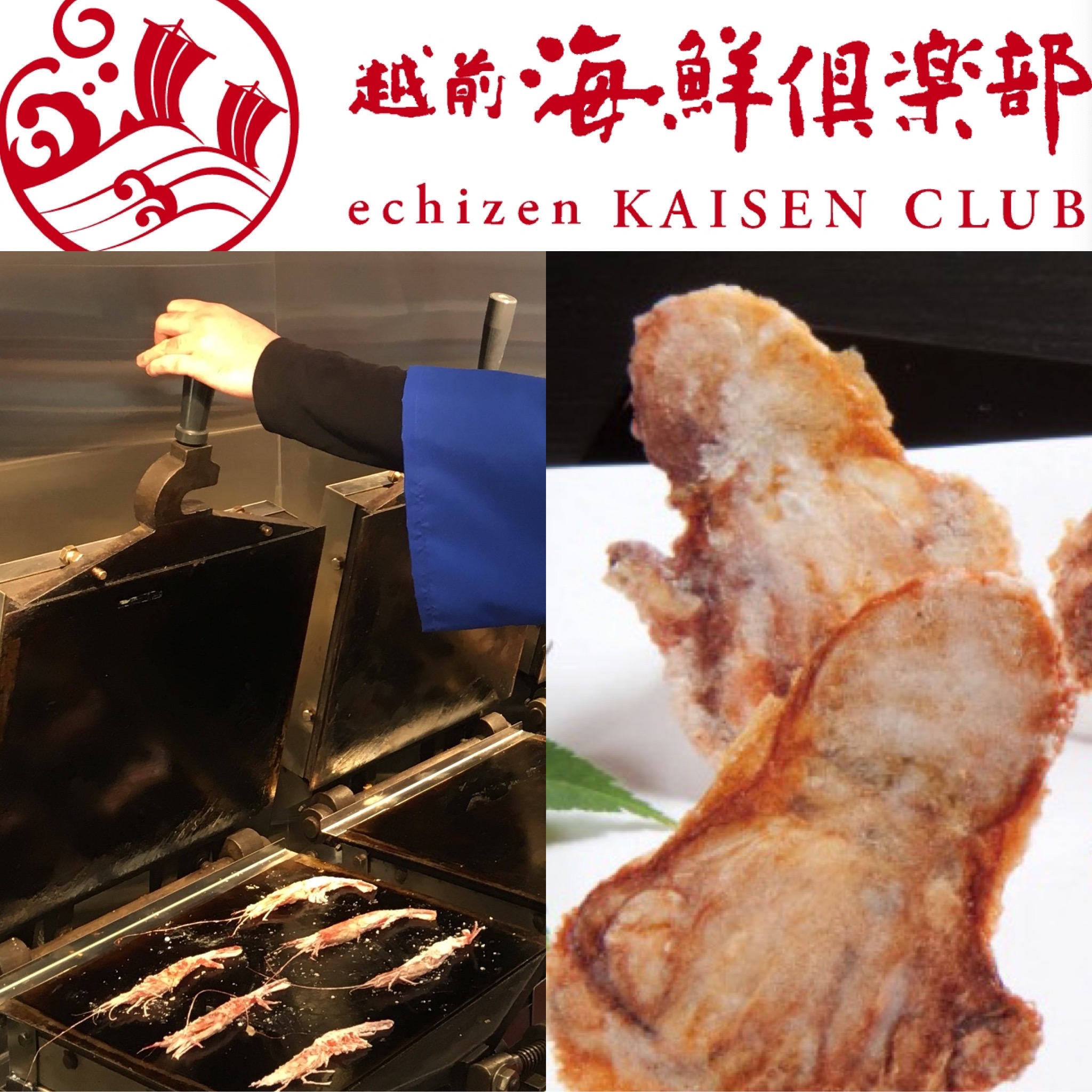 講究素材與味道,美味的海鮮仙貝日本一般的海鮮仙貝(煎餅),使用梗米等製作的麵漿揉入海鮮材料,來增加海鮮的風味。越前海鮮俱樂部店則直接新鮮的「章魚」「魷魚」「蝦」,直接做成了餅。最大的不同是,不是透過添加的風味,而是極盡所能發揮海鮮食材原本的味道。