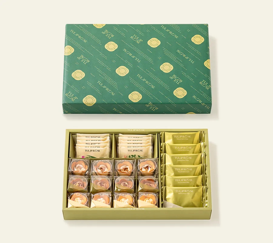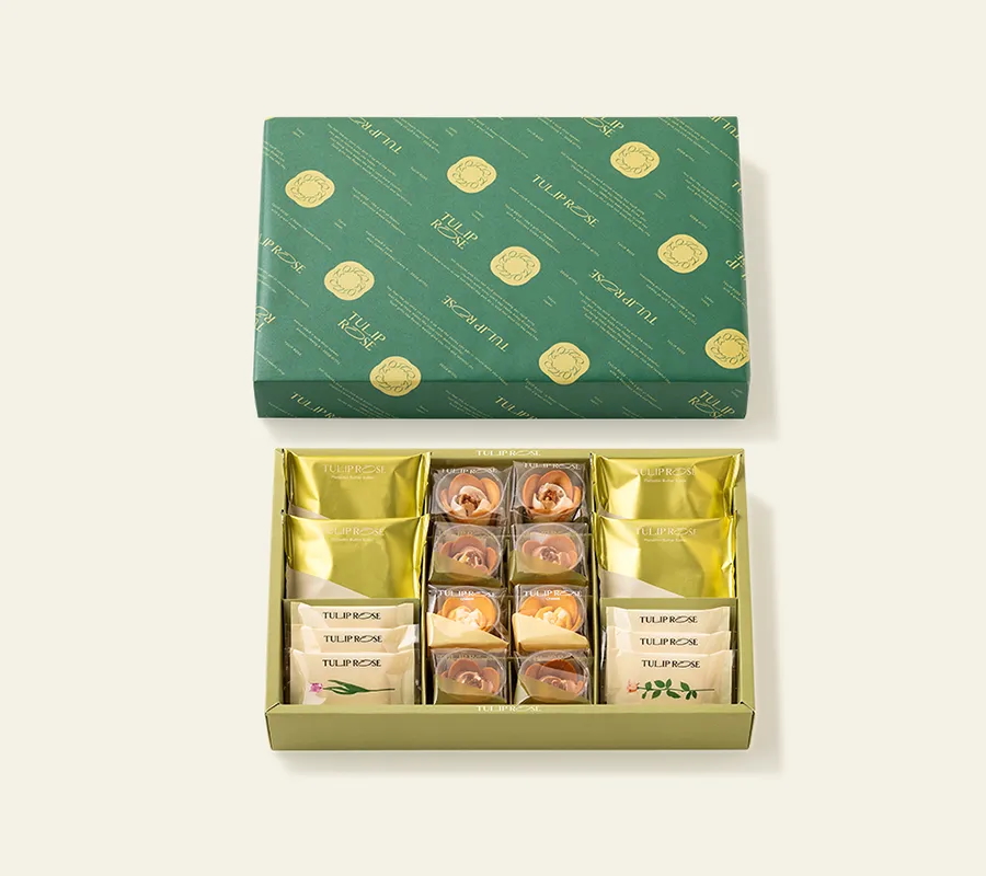 (牛奶鬱金香玫瑰*2/巧克力鬱金香玫瑰*2/白桃鬱金香玫瑰*2/玫瑰園莓果*2/玫瑰園檸檬*2/開心果餅乾*6)