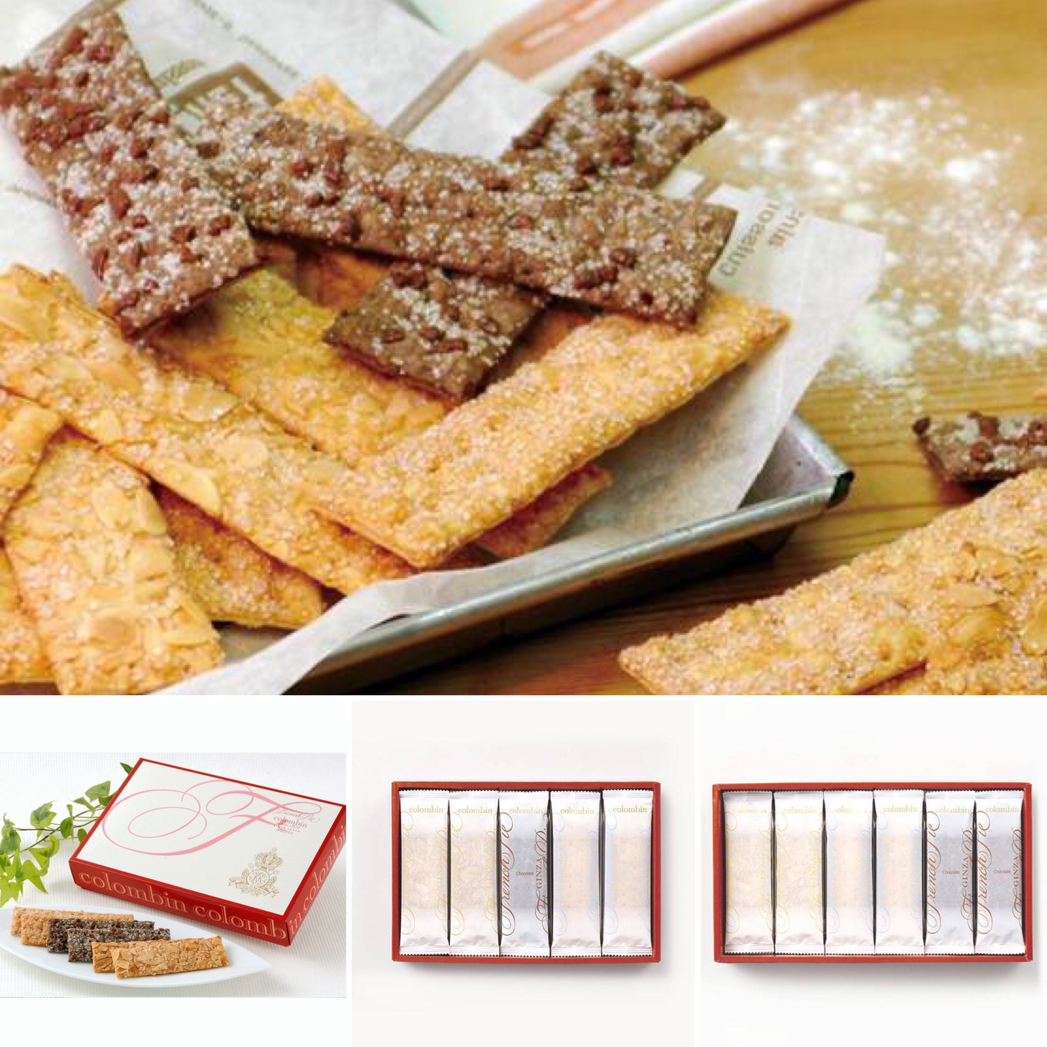 曾榮獲世界西點精選銀獎的銀座法式派,使用新鮮奶油的麵糰層層疊層,一片一片地精心烤制後,分別加上烘烤後的杏仁片、砂糖、巧克力等而成,共有杏仁、原味、巧克力3種口味