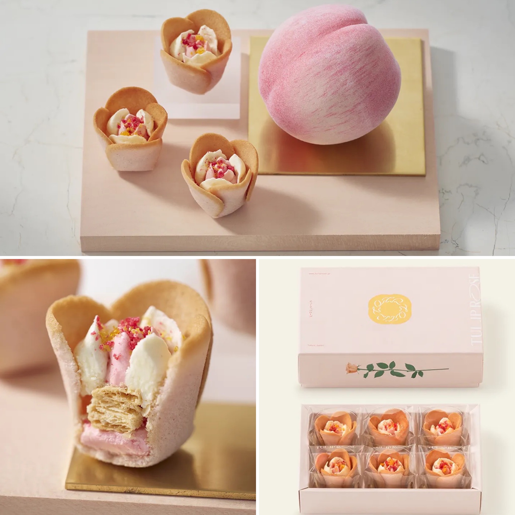 使用日本國產白桃,像剛摘的一樣甜美清新的白桃香氣,加上牛奶感的馬斯卡彭&奶油起司、還有法國產發酵奶油的香濃奶味,襯托了白桃的奢華美味,成就了鬱金香玫瑰的夏季清爽的美味。