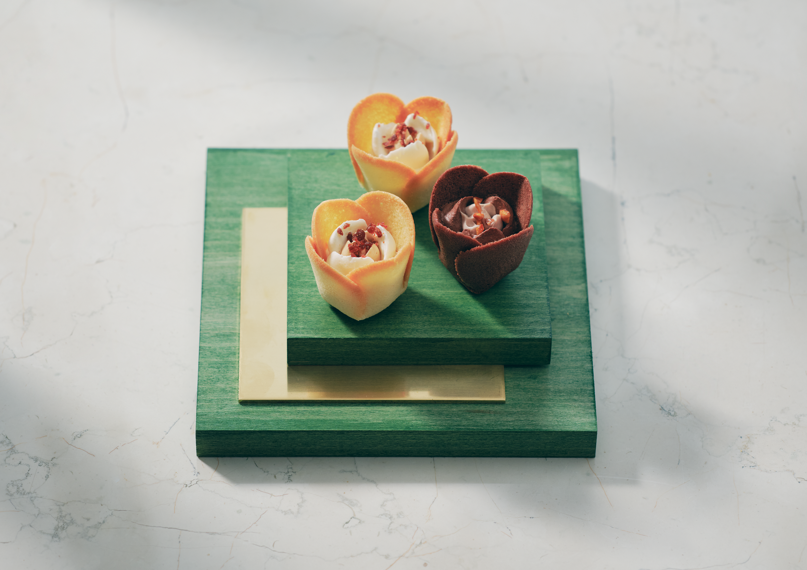 檸檬口味~使用西西里產的檸檬加入可麗餅/麥芽泡芙麵團裡,壓成玫瑰的形狀並烘烤成酥脆巧克力玫瑰花瓣。