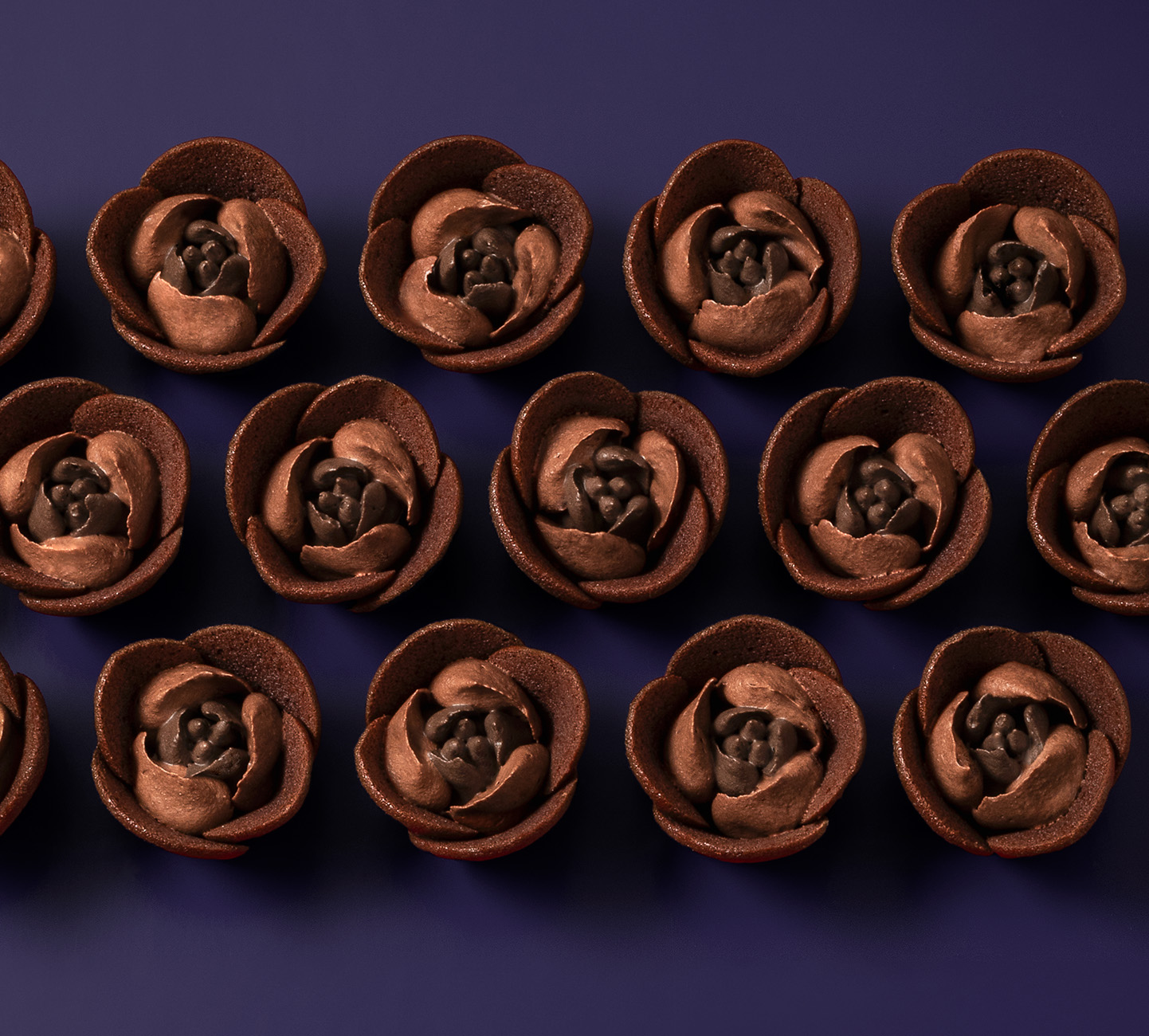 華麗的形狀、一口大小的玫瑰,使用了80%的特級濃可可烘焙成脆皮巧克力基底,上頭搭配苺果和檸檬香味的巧克力做成美麗的玫瑰花瓣。