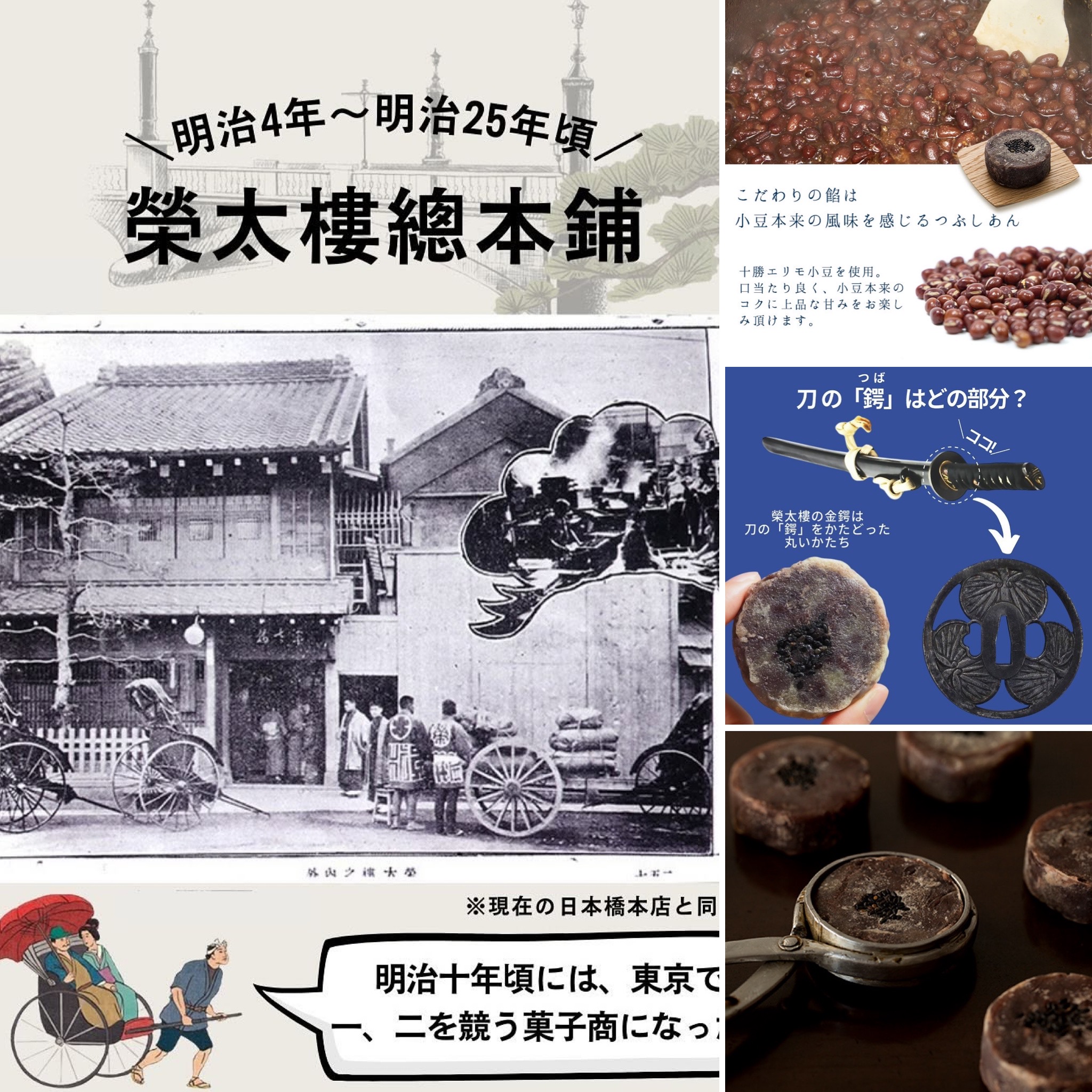 形似日本刀的“鍔(刀柄上的圓金鍔),使用小拇指尖大小、薄如金箔的小麥麵皮包住餡料形成圓形,然後用香油烤出四溢香氣的製作工法,從江戶時代傳承(1850年代中期起)至今未曾改變,是江戶時代代表性的糕點,也是榮太樓的招牌產品。